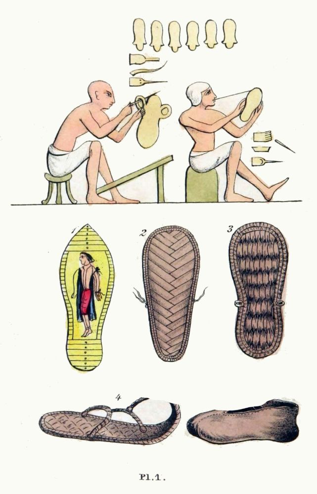 With these materials, it is in no wise difficult to carry our history of shoemaking back to the earliest times, and even to look upon the shoemaker at his work, in the early days of Thothmes the third, who ascended the throne of Egypt, according to Wilkinson, 1495 years before Christ, and during whose reign, the Exodus of the Israelites occurred. The first of our plates contains a copy of this very curious painting, as it existed upon the walls of Thebes, when the Italian scholar Rossellini copied it for his great work on Egypt. The shoemakers are both seated upon low stools (real specimens of such articles may be seen in the British Museum), and are both busily employed, in the formation of the sandals then usually worn in Egypt, the first workman is piercing with his awl the leather thong, at the side of the sole, through which the straps were passed, which secured the sandal to the foot;{9}