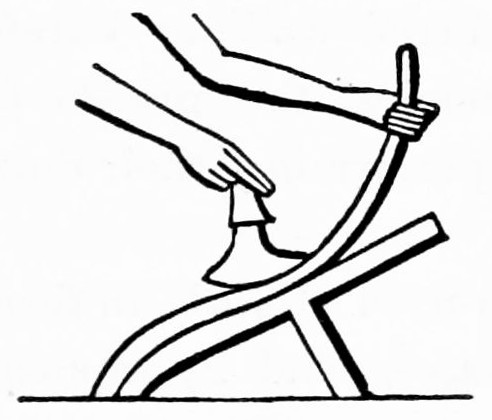 before him is a low sloping bench, one end of which rests upon the ground; his fellow-workman is equally busy, sewing a shoe, and tightening the thong with his teeth, a primitive mode of working which is occasionally indulged in at the present day. Above their heads is a goodly row of sandals, probably so placed, to attract a passing customer; the shops in the East being then, as now, entirely open and exposed to every one who passed. As the ancient Egyptian artists knew nothing of perspective, the tools of the workmen that lie around, are here represented above them: they bear, in some instances, a resemblance to those used in the present day; the central instrument, above the man who pierces the tie of the sandal, having the precise shape of the shoemaker’s awl still in use, so very unchanging are articles of utility. In the same manner, the semicircular knife used by the ancient Egyptians three or four thousand years ago, is precisely similar to that of our modern curriers, and is thus represented in a{10} painting at Thebes, of that remote antiquity. The workman, it will be noticed, cuts the leather upon a sloping bench, exactly like that of the shoemaker already engraved.