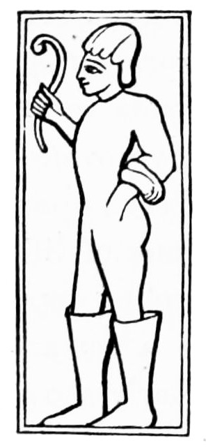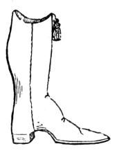 Close boots reaching nearly to the knee where they are met by a wide trowser, are not uncommon upon these sculptures, being precisely the same in shape and appearance as those worn by the modern Cossacks. Indeed, there is nothing in the way of boots that may not be found upon the existing monuments of early nations, precisely resembling the modern ones. The little figure here given might pass for a copy of the boots worn by one of the soldiers of King William the Third’s army, and{21} would not be unworthy of uncle Toby himself, yet it is carefully copied from a most ancient specimen of Etruscan sculpture, in the possession of Inghirami, who has engraved it in his learned work the “Monumenti Etruschi;” the original represents an augur, or priest, whose chief duty was to report and explain supernatural signs.