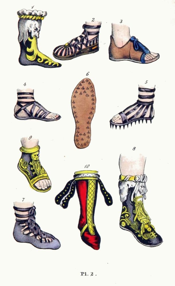 The Roman shoes then had various names, and were distinct badges of the position in society held by the wearer. The solea, crepida, pero, and soccus, belonged to the lower classes, the laborers and rustics, the caliga was principally worn by soldiers, and the cothurnus by tragedians, hunters, and horsemen, as well as by the nobles of the country.