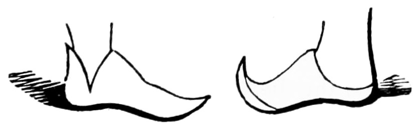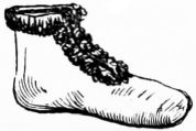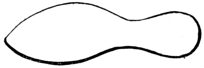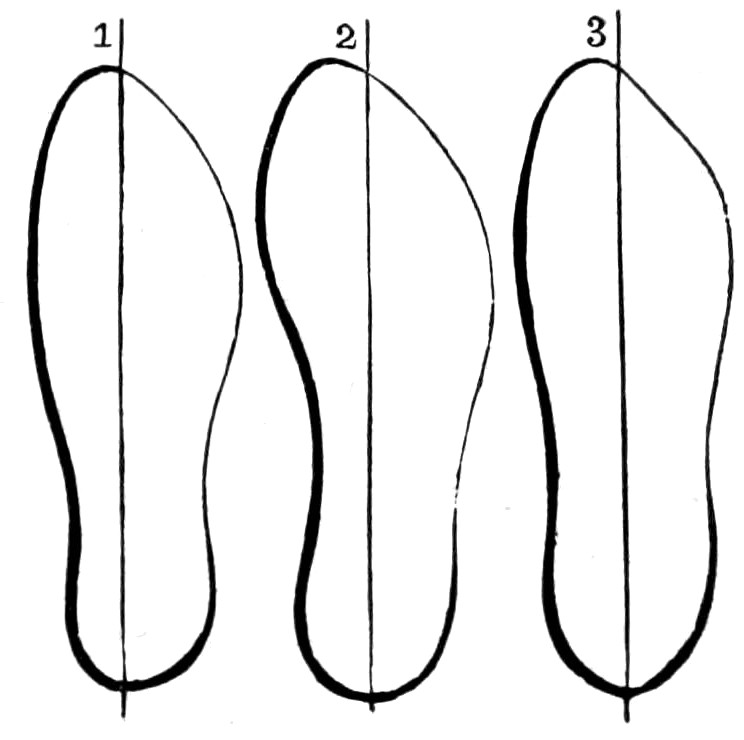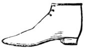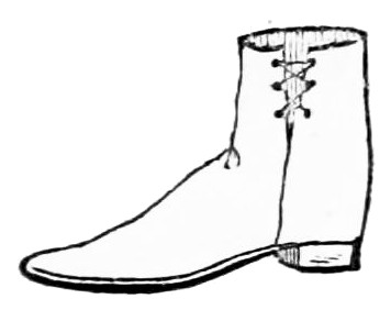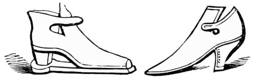 The Saxon figures, as given in the drawings by their own hands, to be seen in manuscripts in most of our public libraries, display the costume of this people, from the ninth century downward; and the minute way in which every portion of the dress is given, affords us clear examples of their boots and shoes. According to Strutt, high shoes, reaching nearly to the middle of the legs, and fastened by lacing in the front, and which may also be properly considered as a species of half-boots, were in use in this country as early as the tenth century; and the only apparent difference between the high shoes of the ancients and the moderns, seems to have been that the former laced close down to the toes, and the latter to the instep only. They appear in general to have been made of leather, and were usually fastened beneath the ankles with a thong, which passed through a fold upon the upper part of the leather, encompassing the heel, and which was tied upon the instep. This method of securing the shoe upon the foot, was certainly well con{32}trived both for ease and convenience. Three specimens of shoes are here given from Saxon drawings. The first is the most ancient and curious; it is copied from “the Durham Book,” or book of St. Cuthbert, now preserved among the Cottonian manuscripts in the British museum, and is believed to have been executed as early as the seventh century, by the hands of Eadfreid, afterward bishop of Lindisfarne, who died in 721. It partakes of the nature of shoe and sandal, and with the exception of the buttons down the front, is precisely like the Persepolitan sandal already engraved and described, as well as like the Roman ones constructed on the same model, and it is curious to see how all are formed after this one fashion.