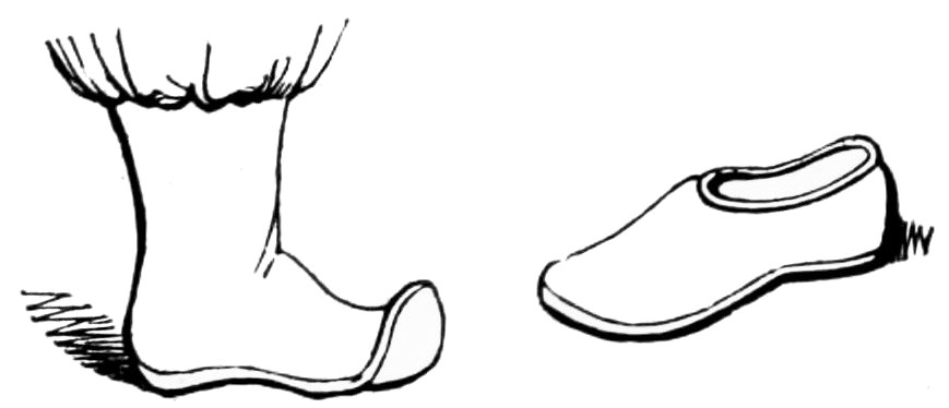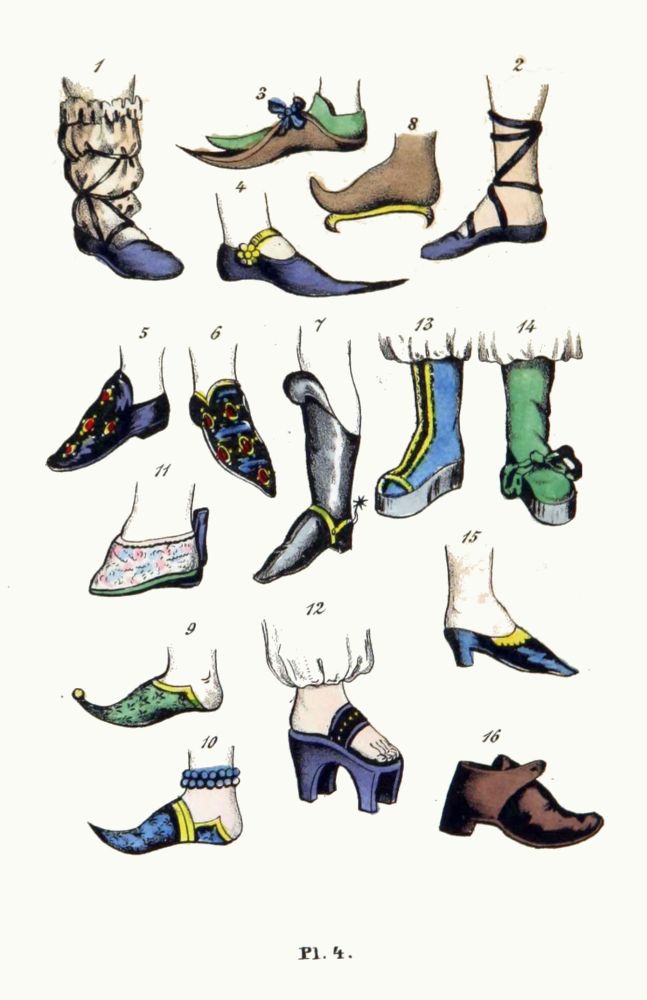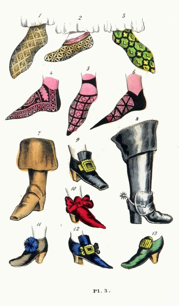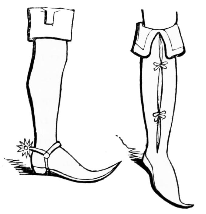 “Among the various innovations,” continues Strutt, “made in dress by the Normans during the twelfth century, none met with more marked and more deserved disapprobation than that of lengthening the toes of the shoes, and bringing{37} them forward to a sharp point. In the reign of Rufus, this custom was first introduced; and according to Orderic Vitalis, by a man who had distorted feet, in order to conceal his deformity;” but he adds, “the fashion was no sooner broached, than all those who were fond of novelty thought proper to follow it; and the shoes were made by the shoemakers in the form of a scorpion’s tail.” These shoes were called pigaciæ, and were adopted by persons of every class, both rich and poor. Soon after, a courtier, whose name was Robert, improved upon the first idea, by filling the vacant part of the shoe with tow, and twisting it round in the shape of a ram’s horn; this ridiculous fashion excited much admiration. It was followed by the greater part of the nobility; and the author, for his happy invention, was honored with the cognomen Cornardus or horned. The long pointed shoes were vehemently inveighed against by the clergy, and strictly forbidden to be worn by the religious orders. So far as we can judge from the drawings executed in the twelfth century, the fashion of wearing long-pointed shoes did not long maintain its ground. It was, however, afterward revived, and even carried to a more preposterous extent.