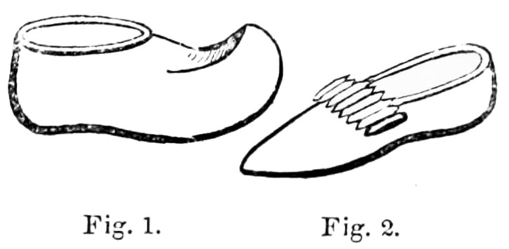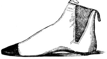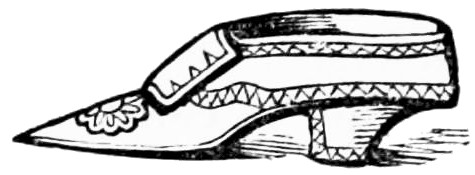 In Sacred Writ are many early notices of shoes, when Moses exhorts the Jews to obedience (Deut. ch. xxix.), he exclaims, “Your clothes are not waxen old upon you, and thy shoe is not waxen old upon thy foot.” In the book of Ruth (chap. iv.) we have a curious instance of the important part performed by the shoe in the ancient days of Israel, in sealing any important business: “Now this was the manner in former time in Israel, concerning redeeming, and concerning changing, for to confirm all things; a man plucked off his shoe, and gave it to his neighbor; and this was a testimony in Israel.” Ruth, and all the property of three other persons, are given over to Boaz, by the act of the next kinsman, who gives to him his shoe in the presence of{15} witnesses. The ancient law compelled the eldest brother, or nearest kinsman by her late husband’s side, to marry a widow, if her husband died childless. The law of Moses provided an alternative, easy in itself, but attended with some degree of ignominy. The woman was in public court to take off his shoe, spit before his face, saying, “so shall it be done unto that man that will not build up his brother’s house:” and probably, the fact of this refusal was stated in the genealogical registers in connexion with his name; which is probably what is meant by his “name shall be called in Israel, the house of him that hath his shoe loosed.” (Deut. xxv.) The editor of Knight’s Pictorial Bible, who notices these curious laws, also adds that the use of the shoe in the transactions with Boaz, are perfectly intelligible; the taking off the shoe, denoting the relinquishment of the right, and the dissolution of the obligation in the one instance, and its transfer in the other. The shoe is regarded as constituting possession, nor is this idea unknown to ourselves, in being conveyed in the homely proverbial expression by which one man is said to “stand in the shoes of another,” and the vulgar idea of “throwing an old shoe after you for luck,” is typical of a wish, that temporal gifts or good fortune may follow you. The author last quoted says, that{16} even at the present time, the use of the shoe as a token of right or occupancy, may be traced very extensively in the East; and however various and dissimilar the instances may seem at first view, the leading idea may be still detected in all. Thus among the Bedouins, when a man permits his cousin to marry another, or when a husband divorces his runaway wife, he usually says, “She was my slipper, I have cast her off.” (Burckhardt’s “Bedouins,” p. 65.) Sir F. Henniker, in speaking of the difficulty he had in persuading the natives to descend into the crocodile mummy pits, in consequence of some men having lost their lives there, says: “Our guides, as if preparing for certain death, took leave of their children; the father took the turban from his own head, and put it upon that of his son; or put him in his place, by giving him his shoes, ‘a dead man’s shoes.’” In western Asia, slippers left at the door of an apartment, denote that the master or mistress is engaged, and no one ventures on intrusion, not even a husband, though the apartment be his wife’s. Messrs. Tyerman and Bennet, speaking of the termagants of Benares, say, “If domestic or other business calls off one of the combatants before the affair is duly settled, she coolly thrusts her shoe beneath her basket, and{17} leaves both upon the spot, to signify that she is not satisfied;” meaning to denote by leaving her shoe, that she kept possession of the ground and the argument during her unavoidable absence.