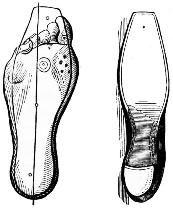 Proverbs.—Several common and proverbial expressions are taken from the shoemaker’s trade. “To stick to the last,” is used of perseverance in an undertaking till its completion. “Nothing is like leather,” signifies to cry up one’s own craft, as in the case of the currier, who would have defended the town with tanned cowhides. “Urit pedem, calceus,” I am in the shoemaker’s stocks. “Ne sutor ultra crepidam,” the shoemaker must not go beyond his last. These were the words of Apel{213}les, a famous painter of antiquity, to a critical Crispin, who properly found fault with an ill-designed slipper. The artist amended his picture accordingly; but the cobbler, ascending to other parts, betrayed the grossest ignorance. “No man,” says a commentator on this proverb, “should pass his opinion in a province of art where he is without a qualification.”—“Etre sur un grand pied dans le monde,” to be on a great foot (or footing) in the world. This favorite French proverb originated at the time when a man’s rank was known by the size of his shoes. Those of a prince measured two feet and a half; a plain cit was allowed only twelve inches. A noble Roman being asked why he had put away his beautiful wife, put forth his foot, and showed his buskins. “Is not this,” said he, “a handsome and complete shoe? yet no man but myself knows where it pinches me.” Hence the saying, “None but the wearer knows where the shoe pinches.” As “tight as a bristle,” is still a common saying of anything that is attached dexterously, or that fits nicely, and is derived from the exactness required by the cobbler in fixing a bristle to the thread or end with which he sews, that it may follow the awl the better. The waxed string pointed with bristle, as at present, was in use as early as the twelfth century.{214}