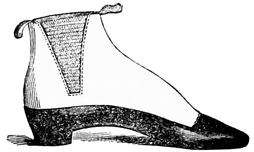 IF we investigate the monuments of the remotest nations of antiquity, we shall find that the earliest form of protection for the feet, partook of the nature of sandals. The most ancient representations we possess of scenes in ordinary life, are the sculptures and paintings of early Egypt, and these the investigations of travelled scholars from most modern civilized countries have, by their descriptions and delineations, made familiar to us, so that the habits and manners, as well as the costume of this ancient people, have been handed down to the present time, by the work of their own hands, with so vivid a truthfulness, that we feel as conversant with their domestic manners and customs, as with those of any modern nation to which the book of{8} the traveller would introduce us. Not only do their pictured relics remain to give us an insight into their mode of life, but a vast quantity of articles of all kinds, from the tools of the workmen, to the elegant fabrics which once decorated the boudoir of the fair ladies of Memphis and Carnac three thousand years ago, are treasured up in the museums, both public and private, of this and other countries.