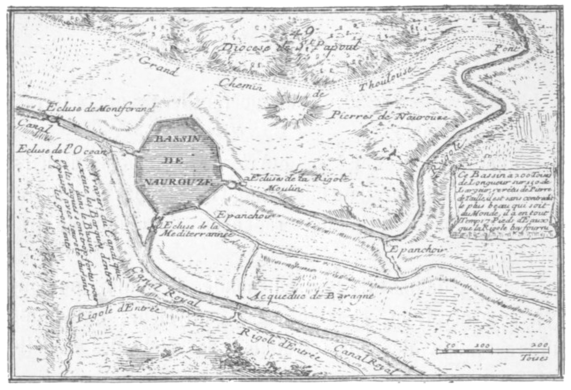 En 1684, la province du Languedoc voulut augmenter le nombre des épanchoirs: le roi envoya Vauban pour visiter le canal; il y vint, en 1686. Étonné de la grandeur de ce magnifique ouvrage, il s'écria dans un moment d'enthousiasme «qu'il eût préféré la gloire d'en être l'auteur, à tout ce qu'il avait.»