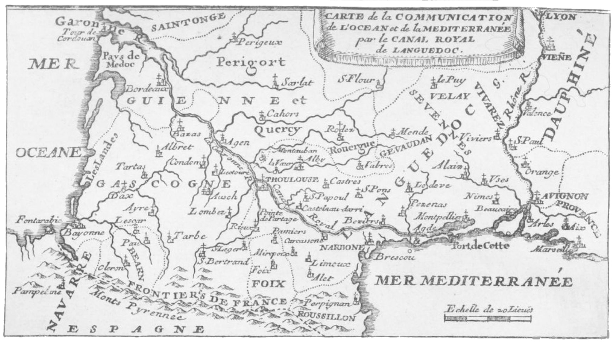 Le 2 mai 1681, M. d'Aguesseau, M. de la Feuille, et le père Mourgues, commissaire du roi, partis de Béziers, visitèrent, à sec, le canal jusqu'à son embouchure dans la Garonne.