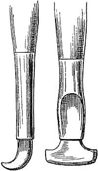 Man benutzt hierzu fast ausschließlich sogenannte Papier- oder Buchbindermesser. Das Messer wird dicht an dem aufgelegten eisernen Lineal hergeführt, und zwar neigt man dasselbe mit dem Stiel soweit nach hinten, daß dessen Achse mit der Fläche des[16] Papieres etwa einen halben rechten Winkel bildet, während die Klinge selbst senkrecht steht. Man achte besonders darauf, daß man das Papier nicht schräg unterschneidet, wodurch man einmal einen faserigen und welligen Schnitt erhalten, dann aber auch die zu unterst liegenden Blätter mehr oder weniger neben der beabsichtigten Stelle zerteilen würde. Eiserne Lineale sind am meisten üblich; hölzerne, nicht zu dünne Schienen haben den Vorteil, daß sie fester auf dem Papier aufliegen und leichter sind, dagegen den Nachteil, daß sie dem Messer kaum einen Widerstand entgegenstellen und öfter abgerichtet werden müssen. Als Unterlage dient ein sogenanntes Schneidebrett von Birnbaum, Ahorn oder Weißbuchenholz. Alle weichen oder mit groben Adern versehenen Hölzer sind ungeeignet. In neuester Zeit sind auch Zinkplatten als Unterlage in Gebrauch gekommen.