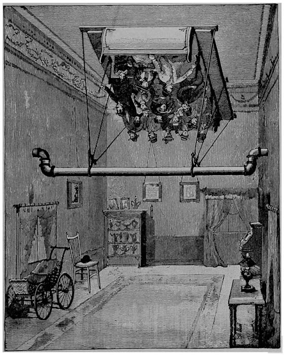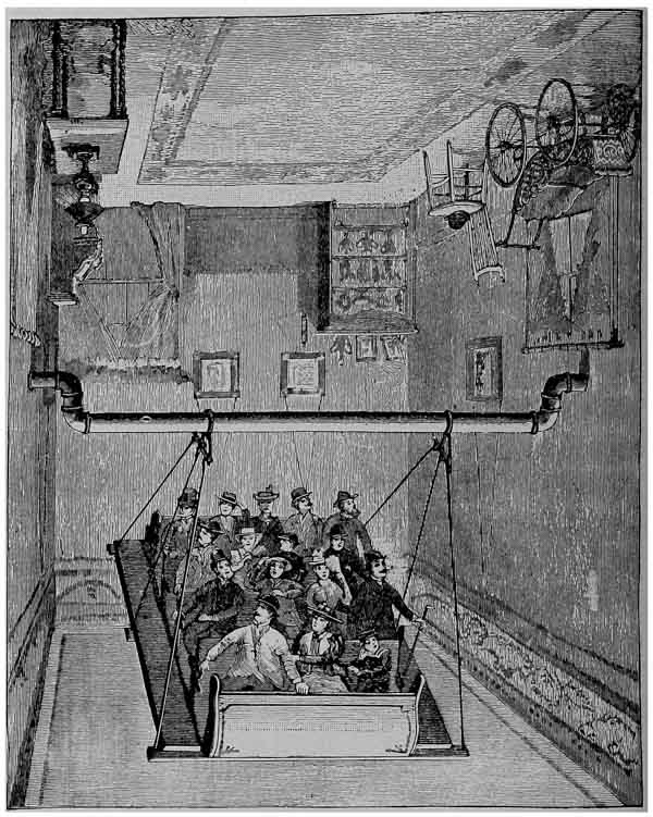 “The room is as completely furnished as possible, everything being, of course, fastened in place. What is apparently a kerosene lamp stands on a table, near at hand. It is securely fastened to the table, which in its turn is fastened to the floor, and the light is supplied by a small incandescent lamp within the chimney, but concealed by the shade. The visitor never imagines that it is an electric lamp, and naturally thinks that it would be impossible for a kerosene lamp to be inverted without disaster, so that this adds to the deception materially. The same is to be said of the pictures hanging on the {xxiii} wall, of the cupboard full of chinaware, of the chair with a hat on it, and of the baby carriage. All contribute to the mystification. Even though one is informed of the secret before entering the swing, the deception is said to be so complete that passengers involuntarily seize the arms of the seats to avoid being precipitated below.”