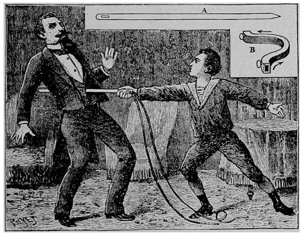 Another very ingenious trick consists in apparently stabbing a man to death, the bloody end of the sword appearing at the back, yet leaving the man uninjured. Since the audience naturally will suspect that the point emerging from the back is not the true end of the sword, the trick has been altered to the effect of replacing the sword with a big needle (A), having tape threaded through its eye. When the assassin’s needle has passed through the victim, it can be pulled out at the other side, together with the tape, where it appears reddened with blood. The stabbing, when performed quickly, before the spectator begins to {xxiv} notice that the blade is somewhat reduced in size, is most startling, and makes a deep impression on the audience; but the artifice through which the manipulation is rendered possible is very simple. The sword, or needle, used for the purpose, is made of a very thin and flexible plate of steel, sufficiently blunt to prevent it from doing any harm. The victim, as if trying to ward off the dangerous weapon, takes hold of it and causes it to slip into the opening of a concealed sheath (B), which he carries strapped around his body, whereupon the assassin makes his thrust. The interior of the sheath contains a red fluid, which dyes the blade and helps to make the deception complete. The accompanying illustration sufficiently explains the performance.