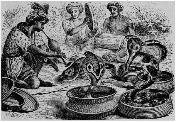 MODERN SNAKE CHARMERS. (From Brehm.)“All this time the cloth remained peaceful and quiet, and there were no uneasy movements of its folds to indicate that the mango crop was flourishing. The juggler now turned his attention to it, however, poked his hands under the cloth, and after a few seconds of mysterious fumbling triumphantly threw off the cloth, and lo! there was a little bunch of leaves about as big as a sprig of water cress sticking up dejectedly from the damp earth. This was straightway deluged with some water and the cloth again thrown over it.