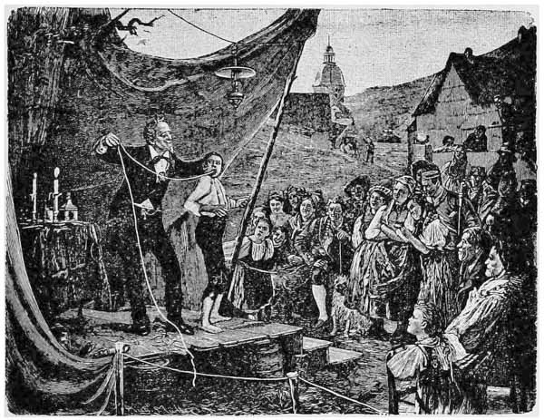 The primitive simplicity of the methods of the Hindu jugglers and the openness of the theatre where they perform their tricks cause wonderment to those who are not familiar with the methods of legerdemain. Mr. Willmann, who had occasion to watch Hindu magicians, says in his book, Moderne Wunder, page 3: “After a careful investigation, it becomes apparent that the greatest miracles of Indian conjurers are much more insignificant than they appear in the latest reports of travelers. The descriptions which in our days men of science have furnished about the wonderful tricks of fakirs, have very little value in the shape in which they are rendered. If they, for instance, speak with admiration about the invisible growth of a flower before their very eyes, produced from the seed deposited by a fakir in {xxviii} a flower-pot, they prove only that even men of science can be duped by a little trick the practice of which lies without the pale of their own experience.”