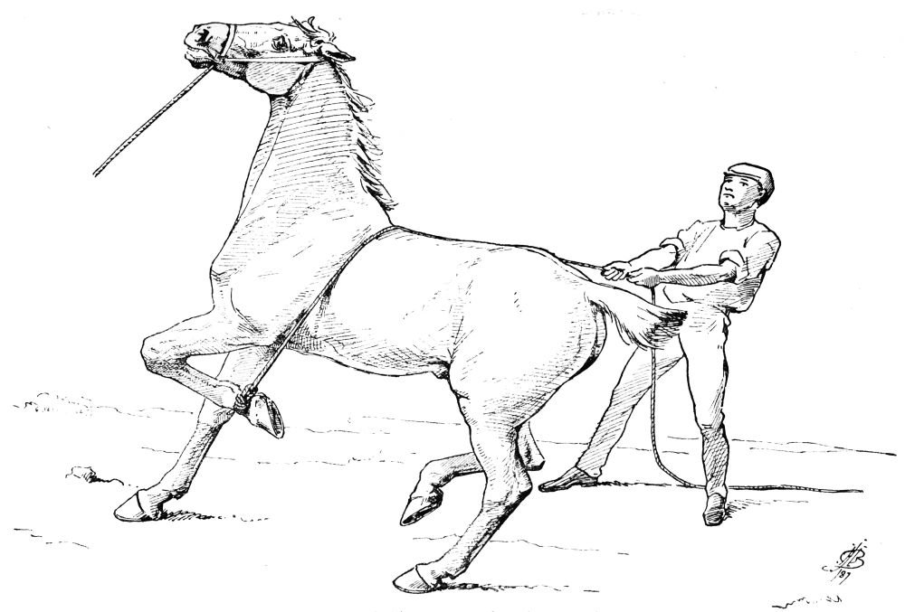 Necessity for obtaining control over the Horse.{22}—In order to fulfil the necessary conditions of safety for himself, the breaker should be able, by the system under which he works—to quote the words of that admirable horse-master, Professor Sample—to make the animal rideable and driveable before he is either ridden or driven. The breaker who employs the ordinary methods, is not alone exposed to danger when mounting, or even driving his pupils for the first few times; but also in the preliminary handling, unless, indeed, in the case of young foals. The advice to go boldly up to the horse and show him that you are not afraid of him, so freely tendered on such occasions, should be treated by its recipient as a piece of “cheap swagger,” or the outcome of pretentious ignorance; for, even granted that such a demeanour would efficiently soothe a terrified animal, or cow a treacherously-disposed one—suppositions that are altogether absurd—such counsel would in no way supply the necessary foolhardiness for such an undertaking. My{23} advice to either amateur or professional is, never to give a horse a chance of doing wrong; so, in order to be consistent after having said this, I shall endeavour to describe a method by which any horse, unsecured, say, in a yard or loose box, can be brought under complete control with, practically speaking, no risk to the operator.