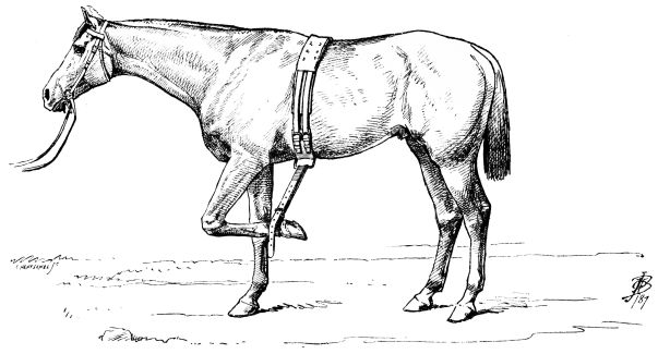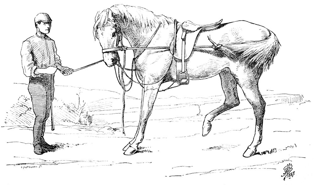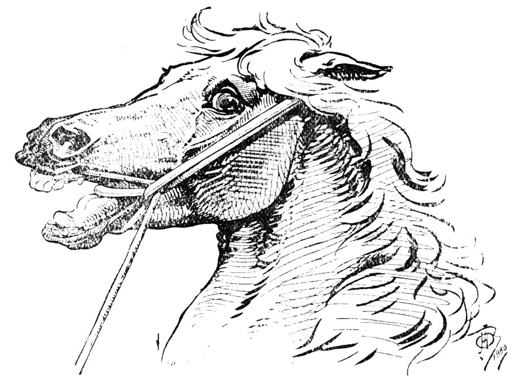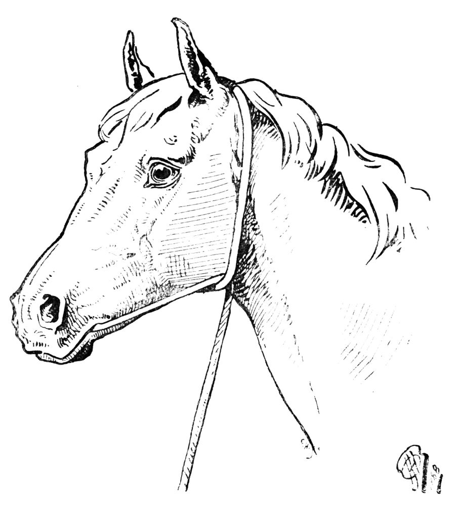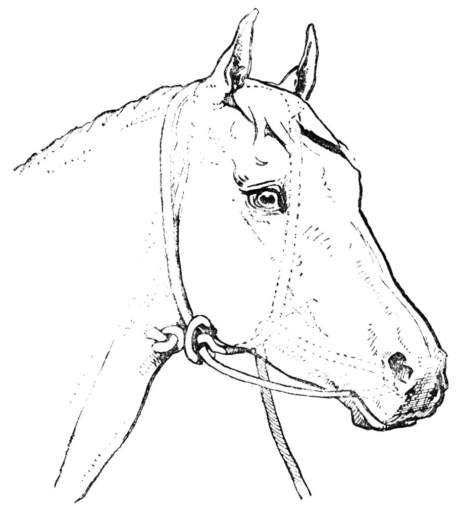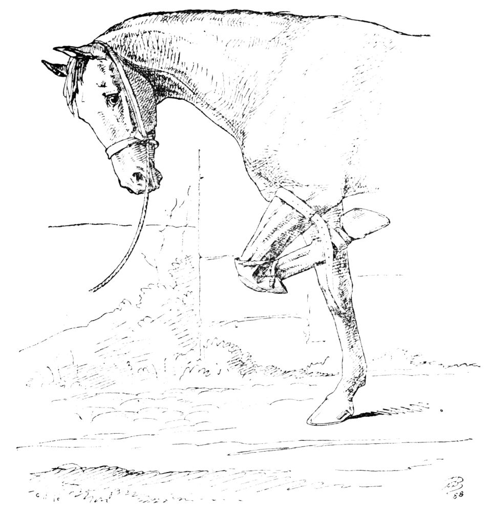 Mental qualities of the Horse.—The possibility of our being able to obtain an easy mastery over the horse, who is greatly our superior in strength and activity, and quite our equal in pluck, rests on the fact that instinct, rather than reason, guides his actions. To investigate this, we may try the experiment, when standing to the side and a little to the rear of a kicker, of touching him about the hocks or quarters with a conveniently long stick, when, if he “lets out” straight behind him, we may conclude that this is a purely reflex or instinctive action on his part. If the animal kicks at the stick, as the cause of annoyance, he certainly conducts himself{8} in a manner that is not altogether irrational. But if he tries to kick the man who holds the stick, we cannot deny him the possession of reasoning power. In order that my meaning be not misunderstood, I here suppose that this experimental horse is one which would viciously kick a person who, when standing behind him, would be rash enough to touch the animal, however gently, with his hand; and not one whose kick would be more of a push—to remove an offending object—than a blow. Luckily, horses that can reason, even to such a small extent as this, are rare.