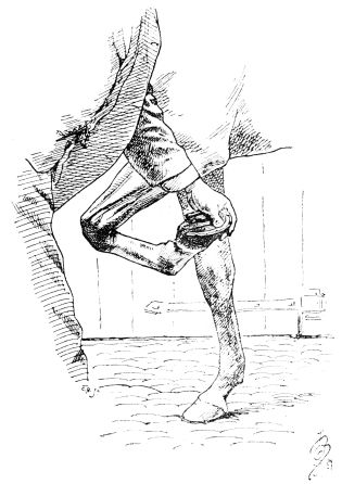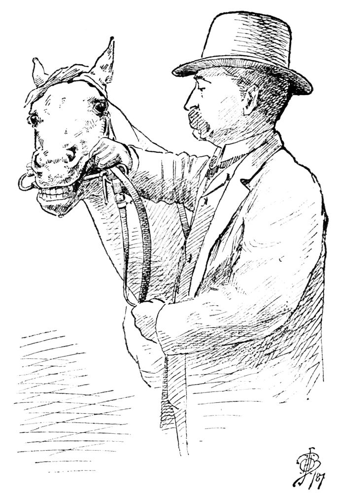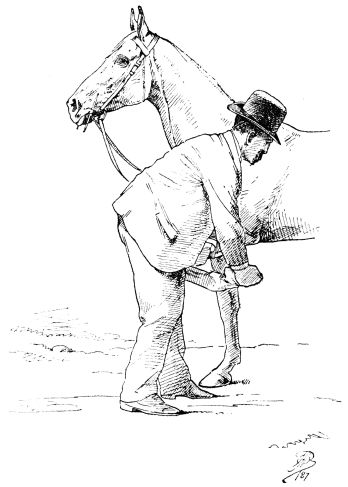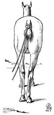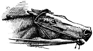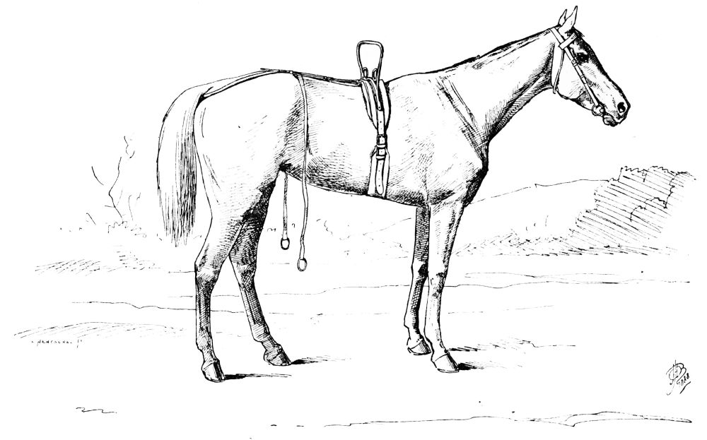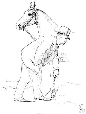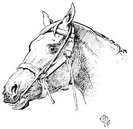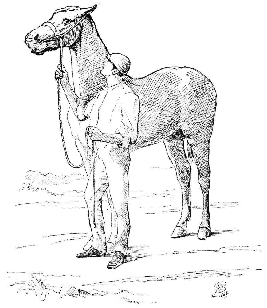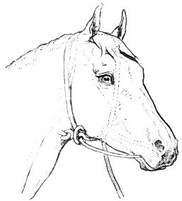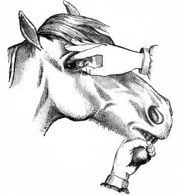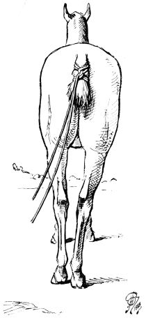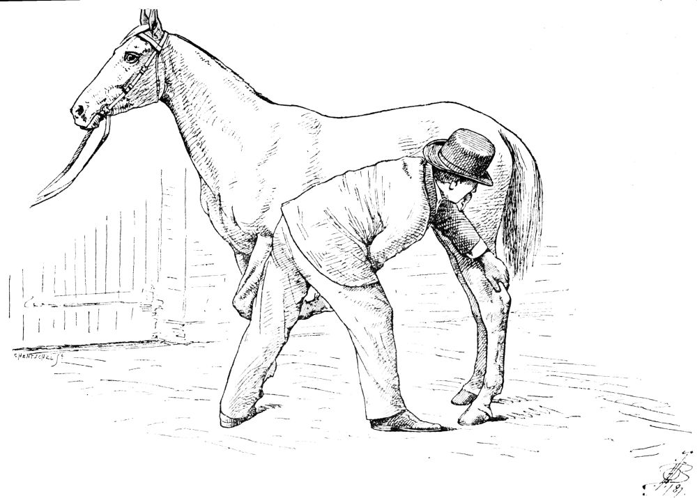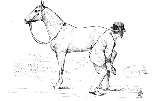 Mental qualities of the Horse.—The possibility of our being able to obtain an easy mastery over the horse, who is greatly our superior in strength and activity, and quite our equal in pluck, rests on the fact that instinct, rather than reason, guides his actions. To investigate this, we may try the experiment, when standing to the side and a little to the rear of a kicker, of touching him about the hocks or quarters with a conveniently long stick, when, if he “lets out” straight behind him, we may conclude that this is a purely reflex or instinctive action on his part. If the animal kicks at the stick, as the cause of annoyance, he certainly conducts himself{8} in a manner that is not altogether irrational. But if he tries to kick the man who holds the stick, we cannot deny him the possession of reasoning power. In order that my meaning be not misunderstood, I here suppose that this experimental horse is one which would viciously kick a person who, when standing behind him, would be rash enough to touch the animal, however gently, with his hand; and not one whose kick would be more of a push—to remove an offending object—than a blow. Luckily, horses that can reason, even to such a small extent as this, are rare.