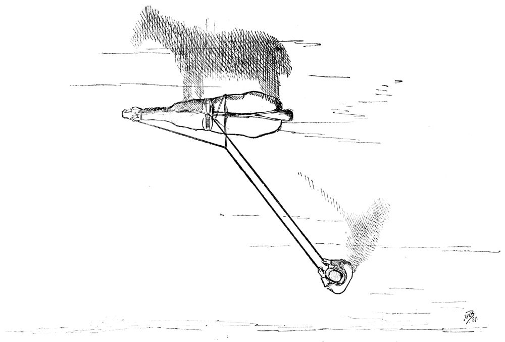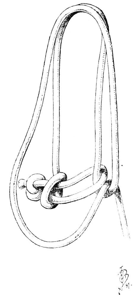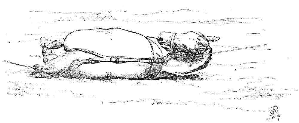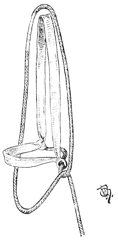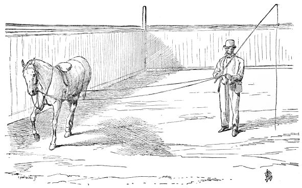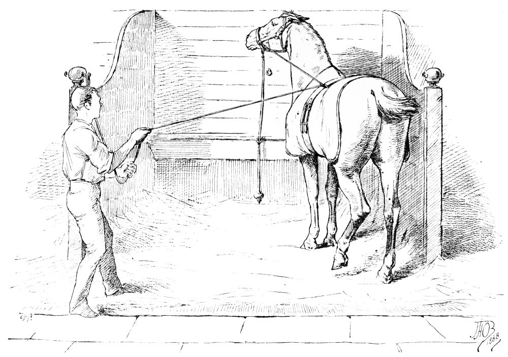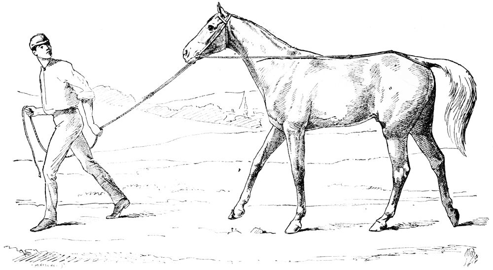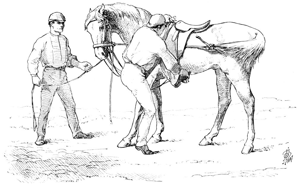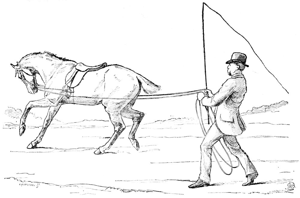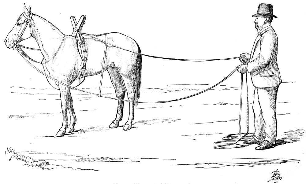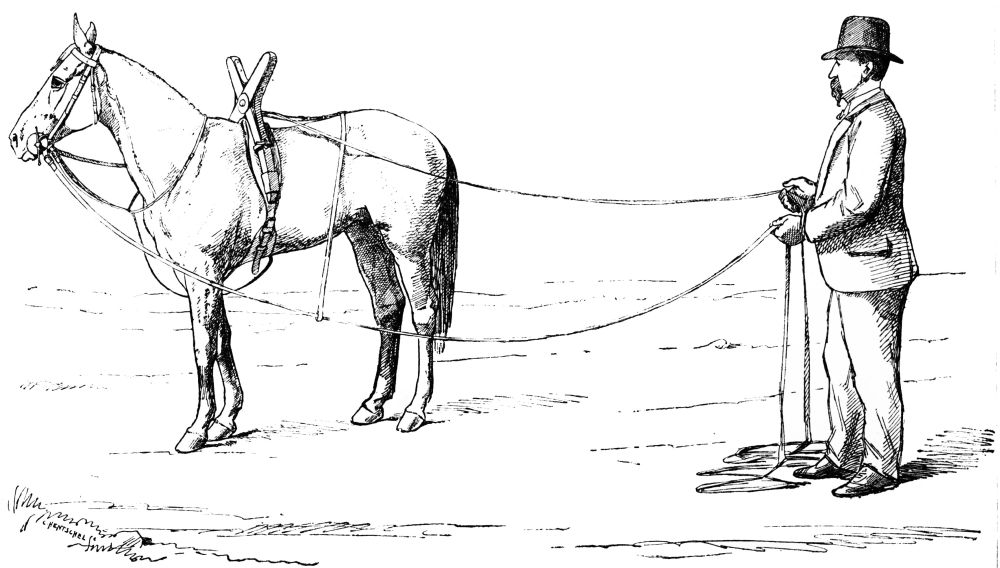 As a personal explanation, I may mention that after having spent many years racing and training in India, during which time I practised the ordinary methods of breaking, I returned to England, where I learned the use of the standing martingale and long driving reins, as applied specially to jumpers, from Mr. John Hubert Moore, who was the cleverest “maker” of steeplechasers Ireland ever knew. He, I may remark, obtained these methods, in his youth, from an old Irish breaker, named Fallon, who was born more than a century ago. I had also valuable instruction in “horse taming” from Professor Sample. Having read an account of MM. Raabe and Lunel’s “hippo-lasso,” as a means of control for veterinary operations, I conceived, with happy results, the idea of utilising this ingenious contrivance in breaking. I also learned, about the same time, how to halter a loose horse without running any danger of being kicked, or bitten.{xiii}
