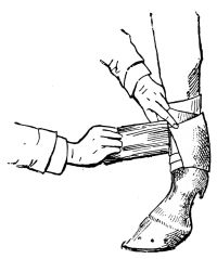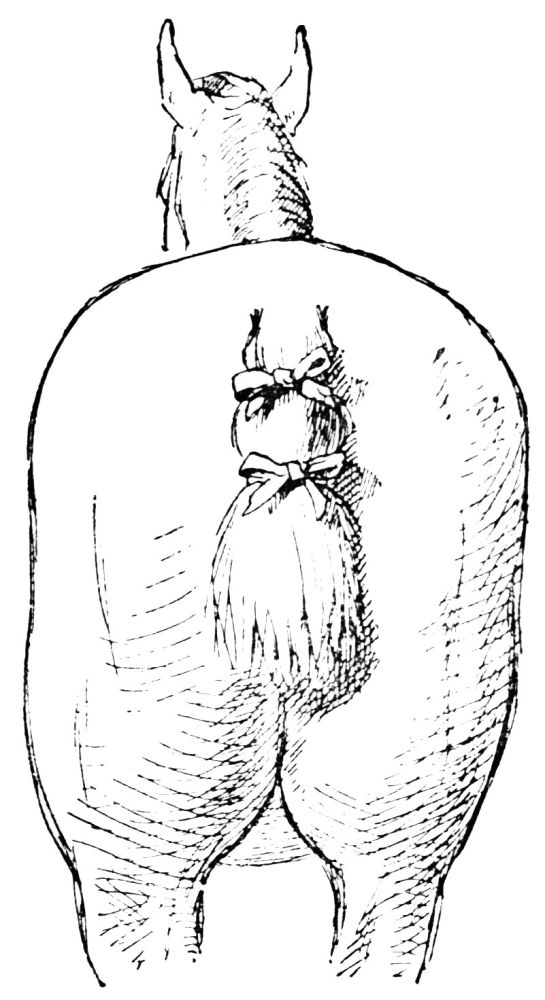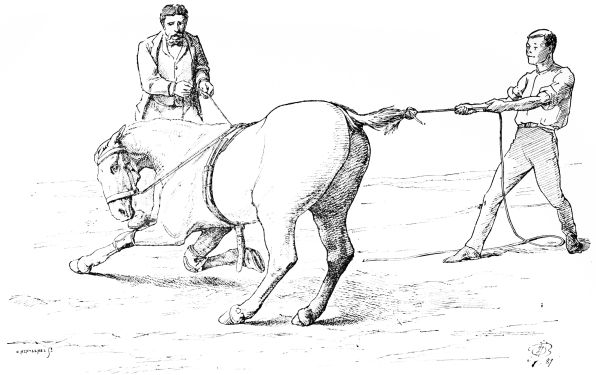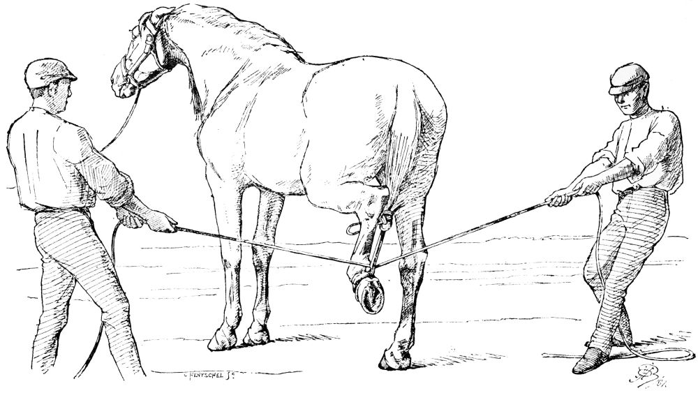 On the nature of the coercion to be applied to unruly Horses.—The only risk run in enforcing the obedience which it is absolutely necessary to exact from unruly horses, is that of spoiling the animal’s pluck and spirit—a contingency that can be incurred only when the fractiousness arises from “nervousness,” or from want of comprehension; for what we term pluck and spirit in the horse should have no taint of stubbornness. The coercion employed should, naturally, be limited to what would be sufficient to overcome the wilfulness; for we should never employ a general effect, when a particular one will answer our purpose. Thus,{24} suppose we had a high-couraged, generous animal, that had been made difficult to mount by a bad rider, on various occasions, prodding the horse in the side with his toe, when attempting to get into the saddle, we might get control over the animal by Pratt’s twitch (see page 113), or by tying him head and tail, and then prove to him that we would not touch him with our toe, when mounting. The Rareyfying of such an animal for this or any similar fault, would be injudicious in the extreme; as it would, almost to a certainty, injuriously affect one of his most valuable qualities, namely, his pluck. As a sulky animal has little or no pluck to lose; we may well content ourselves in gaining his obedience without troubling ourselves much about any possible deterioration of his courage.