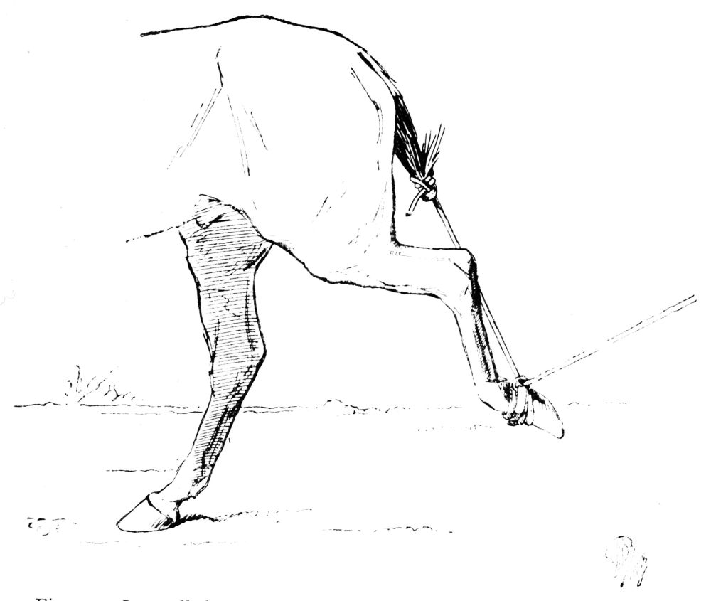 I usually teach horses to lie down (see page 153) by tying up, in the first instance, one fore-leg, arranging the necessary gear, and then making the animal forcibly “go down.” Although many horses will “fight” desperately, time after time, when they are thus compelled to submit, and at a moment when they are utterly helpless, I have never found one that would resent, as a{9} result of this hard-earned experience, the preliminary tying up of the fore-leg. But after having even once been twitched in the usual way, a horse will, as a rule, “fight” the moment his muzzle is touched. In the first case, owing to the more distant connection, the animal is unable to associate the idea of the irksome compulsion employed to make him lie down, with that of tying up his leg; apparently to us an extremely simple mental effort. In the second instance, the action of the muscles, on the hand touching the muzzle, would seem almost entirely instinctive.
