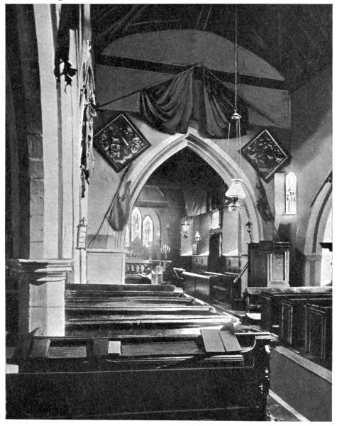 The interior of the church, which has weathered so greatly in the few years of its existence that it resembles an ancient building, is rich in monuments, but at one time possessed many more. The oldest is a lozenge-shaped Flemish brass dated 1529 to one Margaret Svanders, with a curious head-and-shoulders representation of the lady herself; but the oddest of all the memorials here is that to John, Viscount Mordaunt, including a statue of that nobleman, rather larger than life-size, in white[274] marble. It has now been banished to the tower, from the prominent position it formerly occupied in the south aisle, and is not a little startling, seen suddenly and unexpectedly in a half light. The weird-looking figure is like that of a lunatic policeman standing on a dining-room table in his socks, and pretending to direct the traffic, with a sheet wound partly round his nakedness, and something like a rolling-pin in his hand.