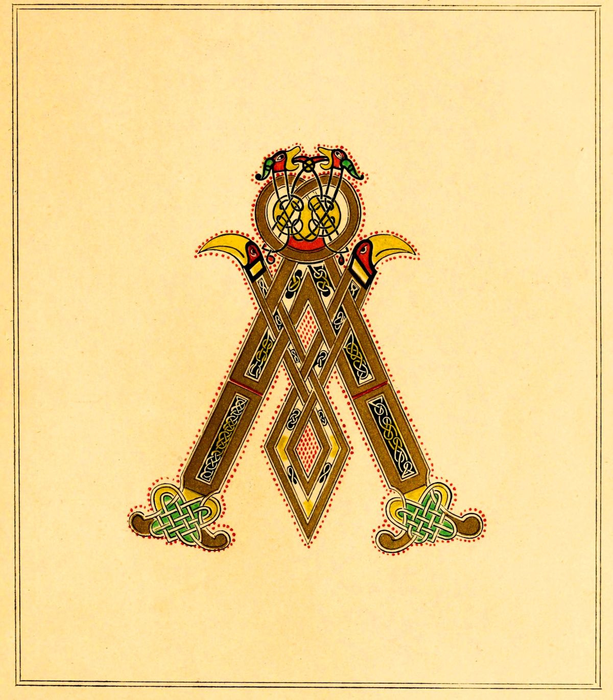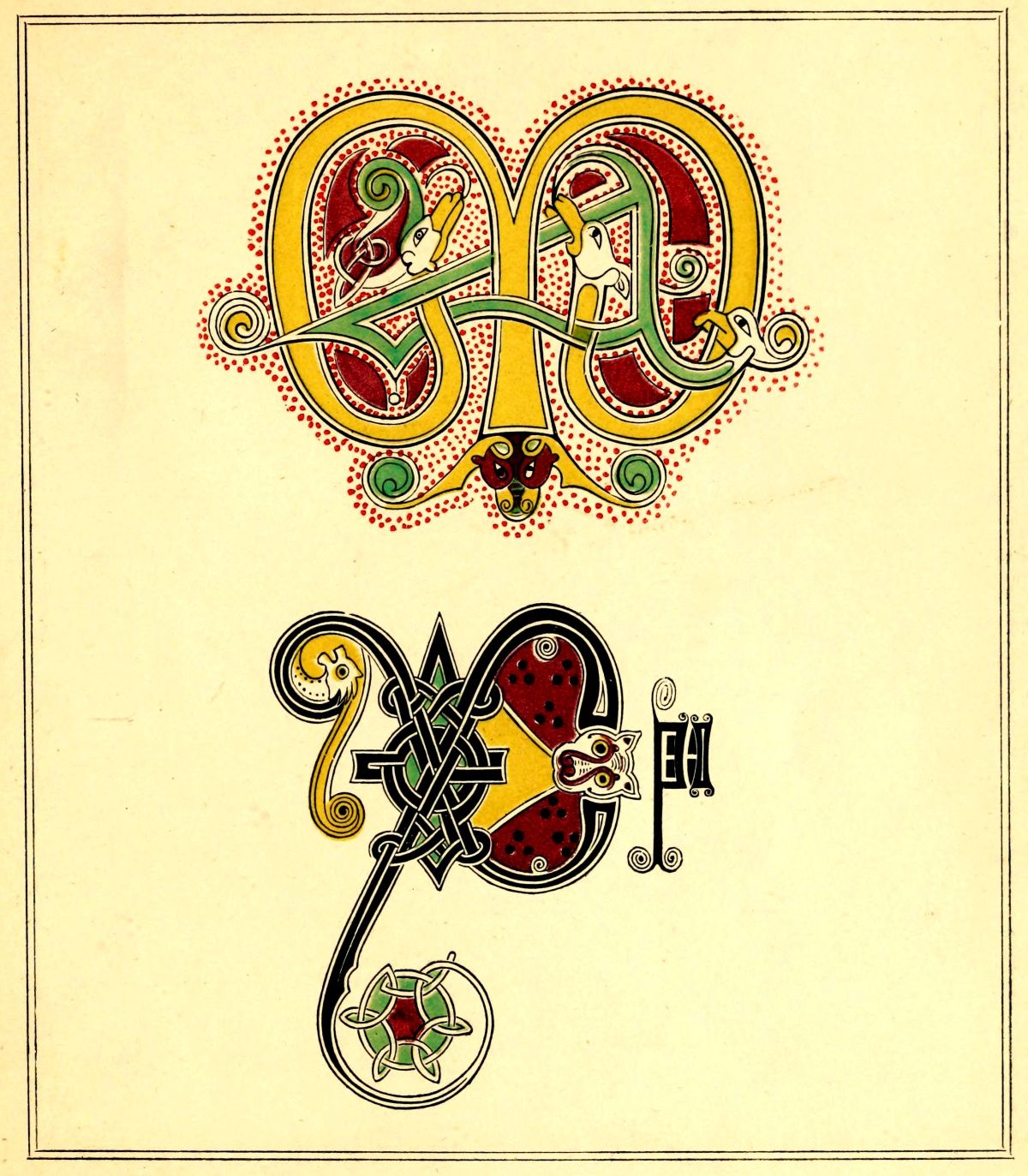 The First may be referred to the earliest centuries of the introduction of the art into this country, perhaps from the 6th to the 9th; its leading characteristics, which are rather distinguished by quaintness than beauty, have been well described as ‘an artistic and ingenious disposition of interwoven threads, bands, or ribbons, of various colours, upon black or coloured grounds, varied by the introduction of extremely attenuated lizard-like reptiles, birds, and other animals, similarly treated.[6] The initials are frequently of enormous size, and extreme intricacy.’ A frequent peculiarity is the practice of surrounding all external outlines with rows of minute red dots.