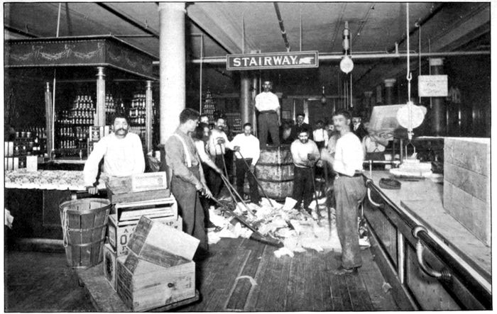 There were two basement rooms opening into each other, and there must be a third that opened onto the street in front of the house. The first room was a much-cluttered kitchen with broken boxes of several sorts of macaroni exposed to view, a well-heated range, a cook in white clothes, innumerable bottles of wine on the shelves and dirty dishes on one side while the clean ones were in orderly piles on the other.
