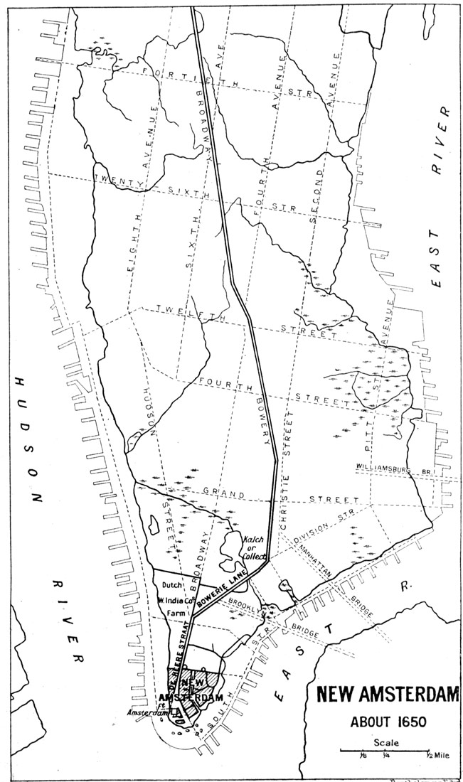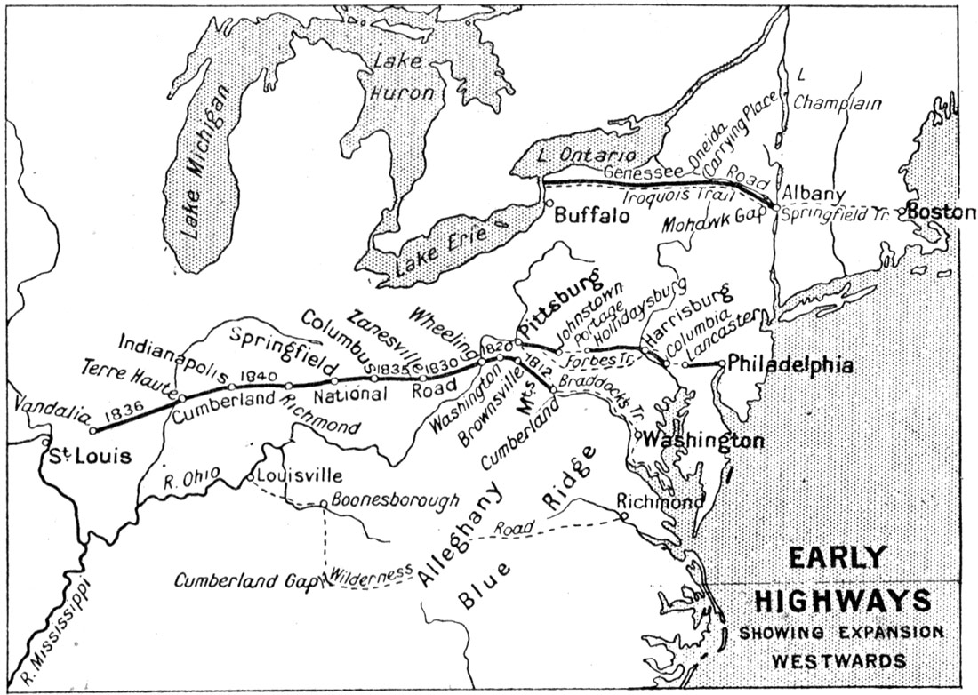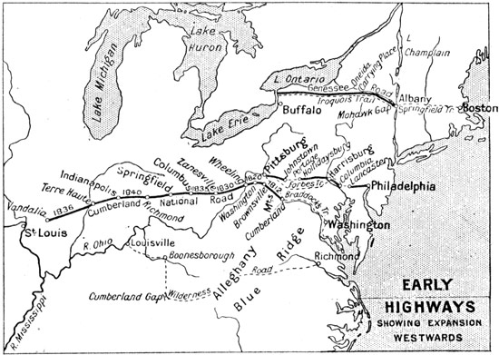 As with the great rivers, so with the great American cities. You can compare "old New York," as represented in one page, with the new New York and its environs which are a world's wonder to-day. Then again you can take the chart of the Early Highways that ran westward into the wilderness and estimate how the power of the engineer has, since the railway came, caught the States in an iron network and rearranged the Americas. Battlefields and sieges, by which the right of the new country to its national life and individuality was [viii] "wrenched," as Tennyson said in his address to the old country,[1] are not forgotten.