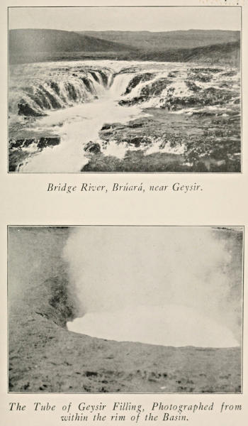 The valley of Reykholt contains many excellent hot springs, some of which have lost part of their former power and do not spout because of the disarrangement of their tubes by recent earthquakes. On a quiet day steam rises from many places in the valley and along the banks of the river. There is one spring of unique formation and peculiar in its situation, the Áhver, River-Hot-Spring. It is in the middle of the river that divides the valley. The river is broad but shallow and the water is cold. In the middle of the stream rises the mound of the hot spring several feet above the water. This mound contains three orifices out of which boiling water pours vigorously. We waded out to this hot mound and climbed to the top. There is no danger of being scalded because the springs no[297] longer spout as in former days on account of the before mentioned earthquake, which has disturbed the tubes. In place of the former periodical spouts of hot water there is now a continuous flow in which the water rises one or two feet above the mouth of the tubes and escapes with much spluttering and accompanied with large volumes of steam. These tubes are a foot or more in diameter. It is a singular location for a hot spring but there is another phenomenon even more surprising. Below the mound of geyserite in the channel of the river there is a long series of holes in the river bed out of which boiling water spurts with such violence in places as to eject steam up through the cold water. Our ponies in fording this stream were quite shy of these hot holes in the bed of the river and insisted on going far down stream.