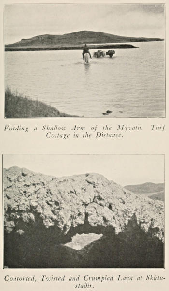 Since writing Chapter VII, I have had another opportunity, in 1913, to examine this stone with more care. I emphatically state that it was not made by the hand of man and that the so-called “measuring marks” on it are nothing but steam holes blown through it by the great pressure when the stone was molten and cooling. The stone has been split open and the marks have the appearance of having been placed there by man. To further substantiate this I would refer to the fact that in 1913 Mr. J. C. Angus of York, England, and myself saw numerous blocks of lava in various places at Mývatn with identical markings. Mr. Angus fully[304] agrees with me in the above statement about the “measuring stone.”