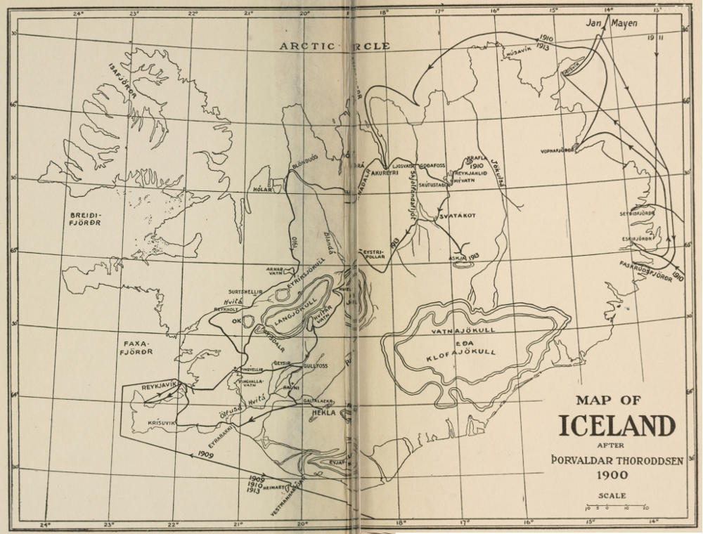 Third,—The kindness with which my numerous lectures on Iceland have been received by the public and the manifest lack of any definite knowledge concerning this country and its people have led me to place before the public this straightforward, simple tale about the Icelanders with some descriptions of their fascinating[7] land. It is the result of extended travels during the summers of 1909, 1910, 1911 and 1913 through the well known sections and in the out-of-the-way places as well as the unknown portions.