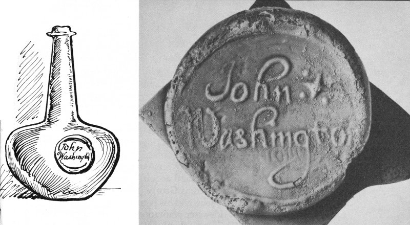 Wine bottle seal found near homesite of John Washington, and drawing of a bottle of the period.