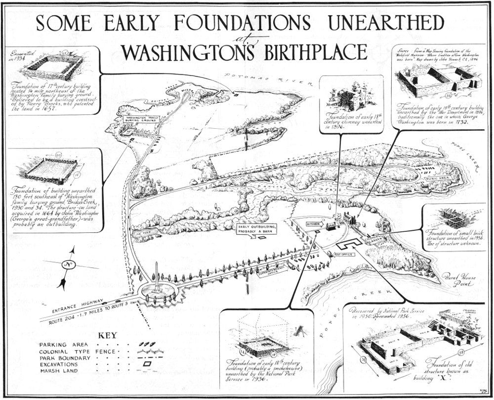 The second period spans a hundred years—a century when the birthplace site was neglected, and was all but forgotten by a growing nation which showed little or no interest in preserving the birthplace of its great military leader and first president. Wild honeysuckle and bramble thickets covered the foundations of the burned home; the place was forgotten for so many years that knowledge of the exact location and use of many of the plantation buildings became lost.