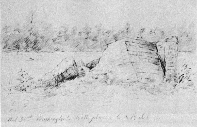 In 1851 the Richmond Whig and Public Advertiser observed: “The birthplace of George Washington is ... marked only by an old brick chimney, a mammoth fig tree, and a freestone slab.... The slab is broken in two.... The neglected condition of the spot bears shame against his country for neglecting to lift up a monument there, to his memory.”