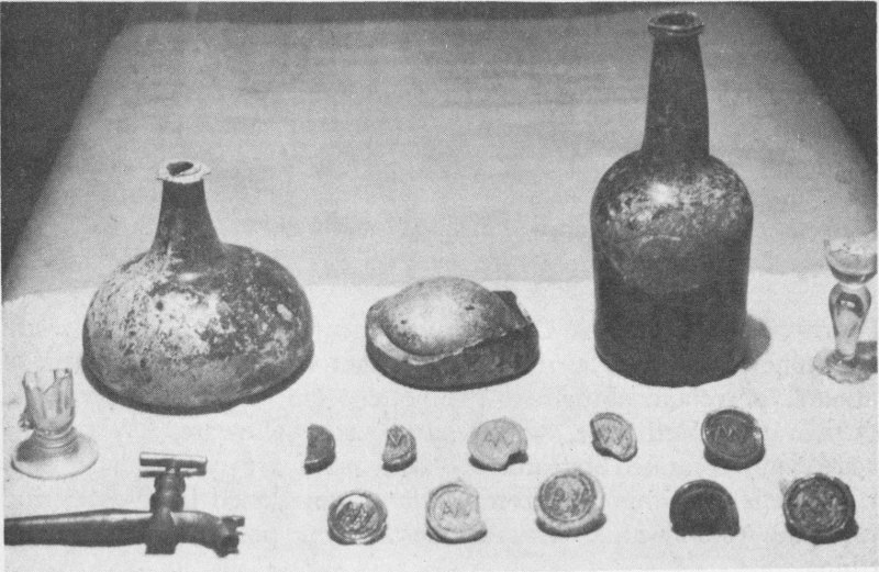 Wine bottles, glasses, seals, and bronze spigot of 1700-80 period found at Wakefield.