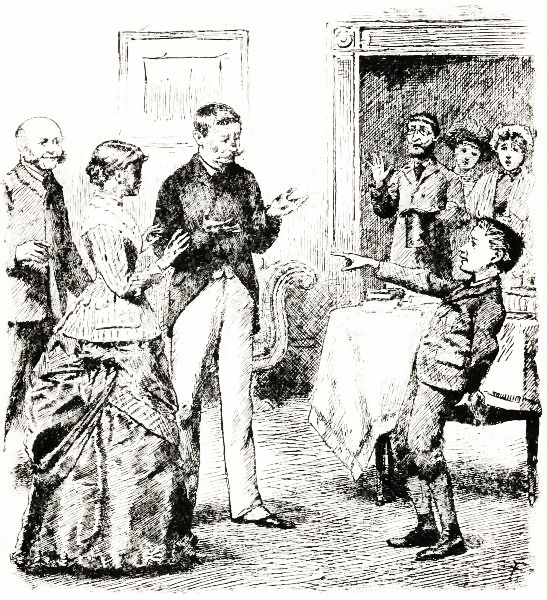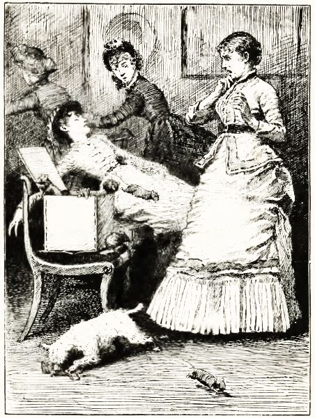 We had a private circus at our house last night—at least that's what father called it, and he seemed to enjoy it. It happened in this way. I went into the back parlor one evening, because I wanted to see Mr. Travers. He and Sue always sit there. It was growing quite dark when I went in, and going towards the sofa, I happened to walk against a rocking-chair that was rocking all by itself, which, come to think of it, was an awfully curious thing, and I'm going to ask somebody about it. I didn't mind walking into the chair, for it didn't hurt me much, only I knocked it over,[Pg 16] and it hit Sue, and she said, "Oh my get me something quick!" and then fainted away. Mr. Travers was dreadfully frightened, and said, "Run, Jimmy, and get the cologne, or the bay-rum, or something." So I ran up to Sue's room, and felt round in the dark for her bottle of cologne that she always keeps on her bureau. I found a bottle after a minute or two, and ran down and gave it to Mr. Travers, and he bathed Sue's face as well as he could in the dark, and she came to and said, "Goodness gracious do you want to put my eyes out?"