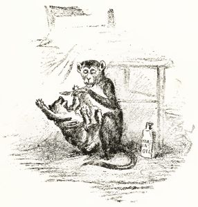 You never saw such a sight as those poor young people were. I had made a mistake, and brought down a bottle of liquid blacking. Mr. Travers had put it all over Sue's face, so that she was jet black, all but a little of one cheek[Pg 19] and the end of her nose; and then he had rubbed his hands on his own face until he was like an Ethiopian leopard, only he could change his spots if he used soap enough.