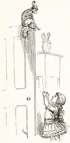 We had tried every plan we could think of to get Harry out of the[Pg 235] chimney, but none of them succeeded. Tom said that if we were to pour a whole lot of oil down the chimney it would make it so slippery that Harry would slide right down into the back parlor, but I wouldn't do it, because I knew the oil would spoil Harry's clothes, and that would make Aunt Eliza angry. All of a sudden I heard a carriage stop at our gate, and there were the grown folks, who had come home earlier than I had supposed they would. Tom said that he thought he would go home before his own folks began to get uneasy about him, so he went out of the back gate, and left me to explain things. They had to send for some men to come and cut a hole through the wall. But they got Harry out all safe; and after they found that he wasn't a bit hurt, instead of thanking me for all Tom and I had done for him, they seemed[Pg 236] to think that I deserved the worst punishment I ever had, and I got it.