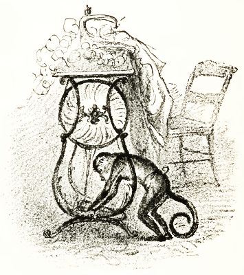 We were getting tired, when I thought how nice it would be to do the[Pg 33] trapeze performance on the chandeliers. There was one in the front parlor and one in the back parlor, and I meant to swing on one of them, and let go and catch the other. I swung beautifully on the front parlor chandelier, when, just as I was going to let go of it, down it came with an awful crash, and that parlor was just filled with broken glass, and the gas began to smell dreadfully.