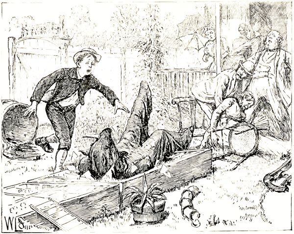 Mr. Travers had walked into a trap, and was swinging by one leg, with his head about six feet from the ground. Nobody knew him at first except me, for when a person is upside down he doesn't look natural; but I knew what was the matter, and told father that it would take two men to bend down the tree and get Mr. Travers loose. So they told me to run and get Mr. Schofield to come and help, and they got the step-ladder so that Sue could sit on the top of it and hold Mr. Travers's head.