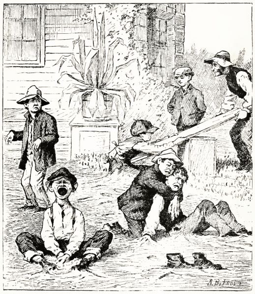 We supposed he had stopped on the way to rest; but after a while we thought we heard a noise, like somebody calling, that was a great way off. We went up on the roof, thinking Harry might have climbed back up the chimney, but he wasn't there. When we got on the top of the chimney we could hear him plain enough. He was crying and yelling for help, for he was stuck about half-way down the chimney, and couldn't get either up or down.