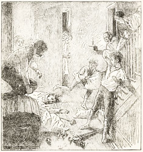 A long while after everybody had gone to bed I heard two men talking in a low tone under the window, and I jumped up to see what was the matter. Two dreadful ruffians were standing under Sue's window, and talking so low that it was a wonder I could hear anything.