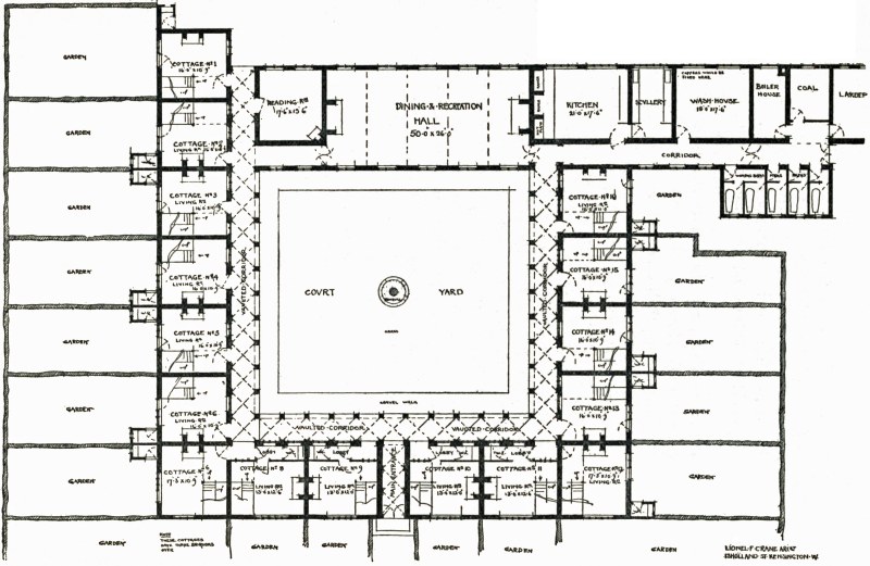The sketch plan and elevation of a collective dwelling (at page 116), for which I am indebted to my architect-son, is offered as a suggestion of what could be done in this way on very simple lines. Each tenant in such a collective dwelling would have his private house or cottage, with the advantage of the use of the common dining-hall, and the service of a collective kitchen; also a general reading-room, and to these rooms a vaulted way with an open arcade on the side next the quadrangle would enable each tenant to reach this part of the building under cover from his own dwelling, which comprises a private garden, as well as the use of the common quadrangle.