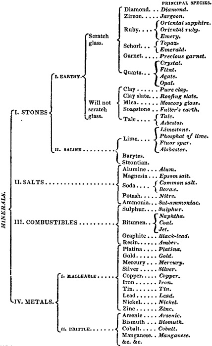 12. The most simple and natural division of minerals is into four classes, of, 1. Stones; 2. Salts; 3. Combustibles; and, 4. Metals; and the following table, which has chiefly been arranged from the system of Werner, the well-known German mineralogist, will exhibit a tolerably correct outline of the classification of these substances. To reduce the whole within the compass of a single page, many of the families, however, have necessarily been omitted.