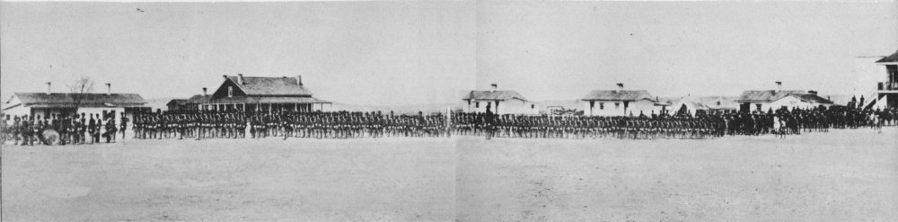 Dress parade at Fort Laramie in 1868. Note “Old Bedlam” at the extreme right. From a photograph by Alexander Gardner in the Newberry Library.