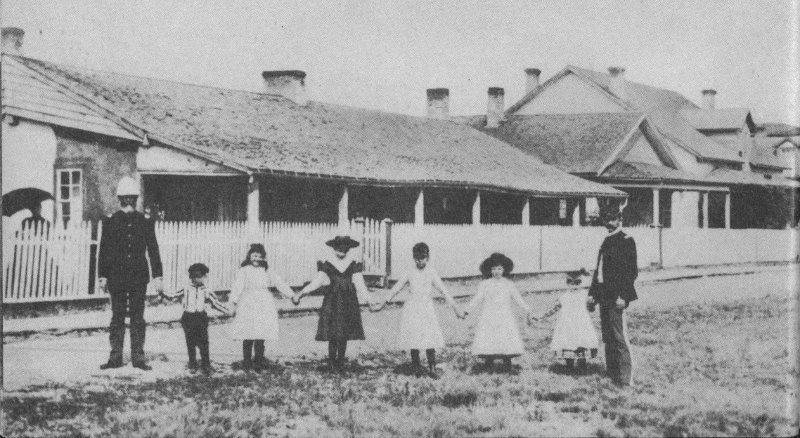 Officers and children in front of now-missing units of officers’ row, about 1889. Courtesy Gen. G. W. McIver.