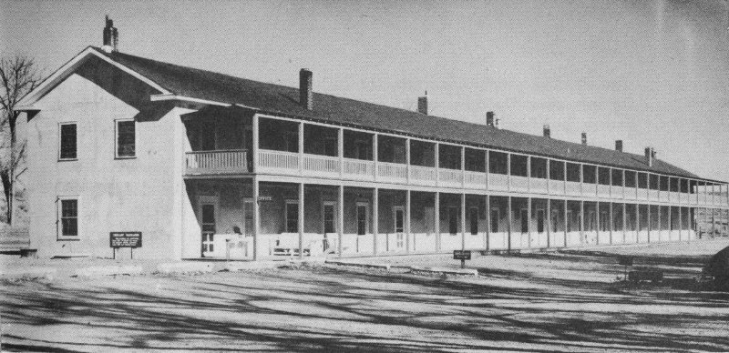 While purchase of the adobe trading post provided the Army with a measure of shelter for men and supplies, it was far from adequate. In late June 1849, Major Sanderson reported that the entire command was already employed in cutting and hauling timber and burning lime. Stone was also quarried and a horse-powered sawmill placed in operation. By winter, a two-storied block of officers’ quarters (to become known as “Old Bedlam”), a block of soldiers’ quarters, a bakery, and two stables had been pushed near enough completion to be occupied.