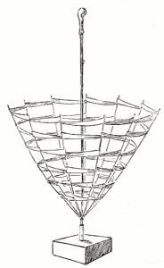 One of the best tricks of De Kolta is called, "The Miraculous Production of Flowers." It may be exhibited on the stage or in the drawing-room, and is equally effective in either place. The performer shows an umbrella from which the covering has been removed and its place supplied by multicolored ribbons, which go from rib to rib, leaving a space between. He then opens this umbrella, and stands it upside down on the stage, resting the ferrule end in a piece of metal tubing, which, in turn, is supported by a stand. He also shows two or three empty shallow wicker baskets, and a sheet of heavy brown paper. His arms being bared to prevent the possibility of anything being concealed in his sleeves, he folds, or rather twists, a sheet of paper into a cone or cornucopia. Every one knows this cone is empty, as they have seen it made, and yet the performer shakes from it enough flowers to fill not only the baskets, but also the inverted umbrella. Every once in a while, when the supply of flowers is apparently exhausted, the paper is opened and shown to be empty, and yet, when again rolled up, the flowers pour from it in as great volume as at first.
