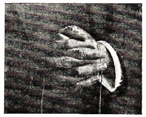 In the second method the palms of the hands are placed together and the thumbs held up. Then a rope, about the size of an ordinary sash cord, is laid just above the fork of the thumbs. The ends are given to two committee-men chosen from the audience, who are asked to pull, so as to convince themselves that the rope is sound; then the thumbs are crossed and pressed down on the rope, which is tied in a double knot.