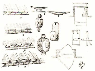 Place the spring between the folds of Fig. 3, so that the arms will lie on F F, and then paste them firmly down by placing over a strip of paper of the same color as the "flower." Next put Fig. 2 between Fig. 3; paste the points C C to E E and G G to B B, and let them dry thoroughly. The flower has now assumed the shape shown in Fig. 5. All that it needs to complete it are two green leaves of paper, silk, or muslin, which are to be pasted one on each side at the smaller end. To make much display, about five hundred of these flowers ought to be used.
