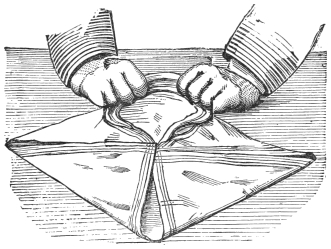 VIII. Carrying Fire in the Hands.—In performing this extremely simple trick, the audience must not be informed of what it is your intention to do, but it should be done when there is any delay in your other tricks, or some hitch occurs in getting anything you require, and which happens not to be at hand. For filling up a gap in a performance, it will be found extremely useful. In giving an entertainment of magic, always have on your table two burning candles; they are both useful and ornamental, and serve to dispel any idea of the spectators that you cannot perform your tricks in a full light. You go to the table, having previously concealed a piece of paper in your hand between the two middle fingers, and place your hands around the flame, saying it is perfectly possible to retain the heat in the hand, and even carry the flame from one candle to another. You then blow out one of the candles, and quickly place your hands round the other, set fire to the paper in your hand, blow out the candle, quickly light the first and then the second, smothering the flame of the paper in your hand. This trick, when well done, causes great astonishment and surprise.