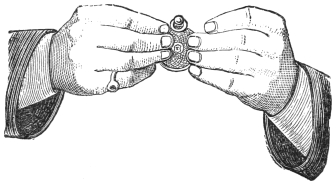 The art of magic, as it is now understood, is no longer a secret and mystic profession; it is a written art, and may be easily acquired by the clever mechanician, or any person having dexterous hands and a large amount of self-possession and impudence. I say “impudence,” because most of the best tricks are really so extremely simple that many persons of a timid or self-conscious disposition would feel ashamed to venture to perform them, in case of what they think must be inevitable detection and exposure. But so blind is poor human nature that the clever conjuror can always select his man for “forcing a card upon him,” even though he makes his dupe believe he has selected one at his own will and choice. At the request of a large number of friends, I will conclude this volume by giving a few tricks which may be performed after a very little practice by anybody who will take a little trouble, and for the execution of which no, or very little, apparatus will be required—at any rate, only such as can be obtained either in any ordinary house, or at a very trifling expense. The task which I have set myself is not, as the reader might imagine, an easy one, for in endeavoring to give some tricks which have not before been already fully explained in books published on the subject, I find that there is scarcely a parlor trick which has not already been explained. Therefore, to give some tricks that have never yet been exposed is really a very difficult and almost impossible task. However, I have done my best, and the following little deceptions which the amateur conjuror may safely perform, will enable him to give a capital evening’s entertainment to his friends or family circle. I would just add one word before quitting the subject of magic and559 conjuring. My object in the foregoing chapters was to show the reader, first, that the art of magic is merely the art of a very clever illusionist, who, by swiftness of execution and a thorough knowledge of the laws of mechanics and optics, can make his audience deceive themselves; secondly, to afford some entertainment to my readers; and, thirdly, to set the ingenious at work to solve the mysteries of the art upon the basis I have given in these chapters. I venture to think, from the observations I have heard, that all these objects have been attained. And now for a few parlor tricks.